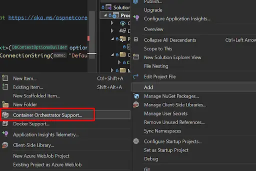 Right-click the project file then goto add then ‘Container Orchestrator Support’