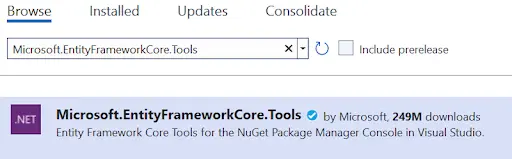 Next, search for Microsoft.EntityFrameworkCore.Tools. Once you get the result, install it and add the migration