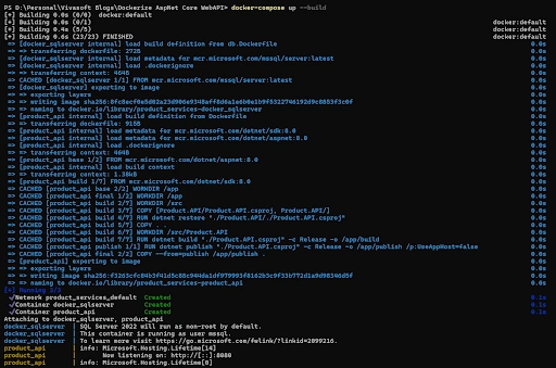 ‘Docker-compose up –build’ This command will build the Docker images for your ASP.NET Core application and SQL Server database, create containers, and start them.