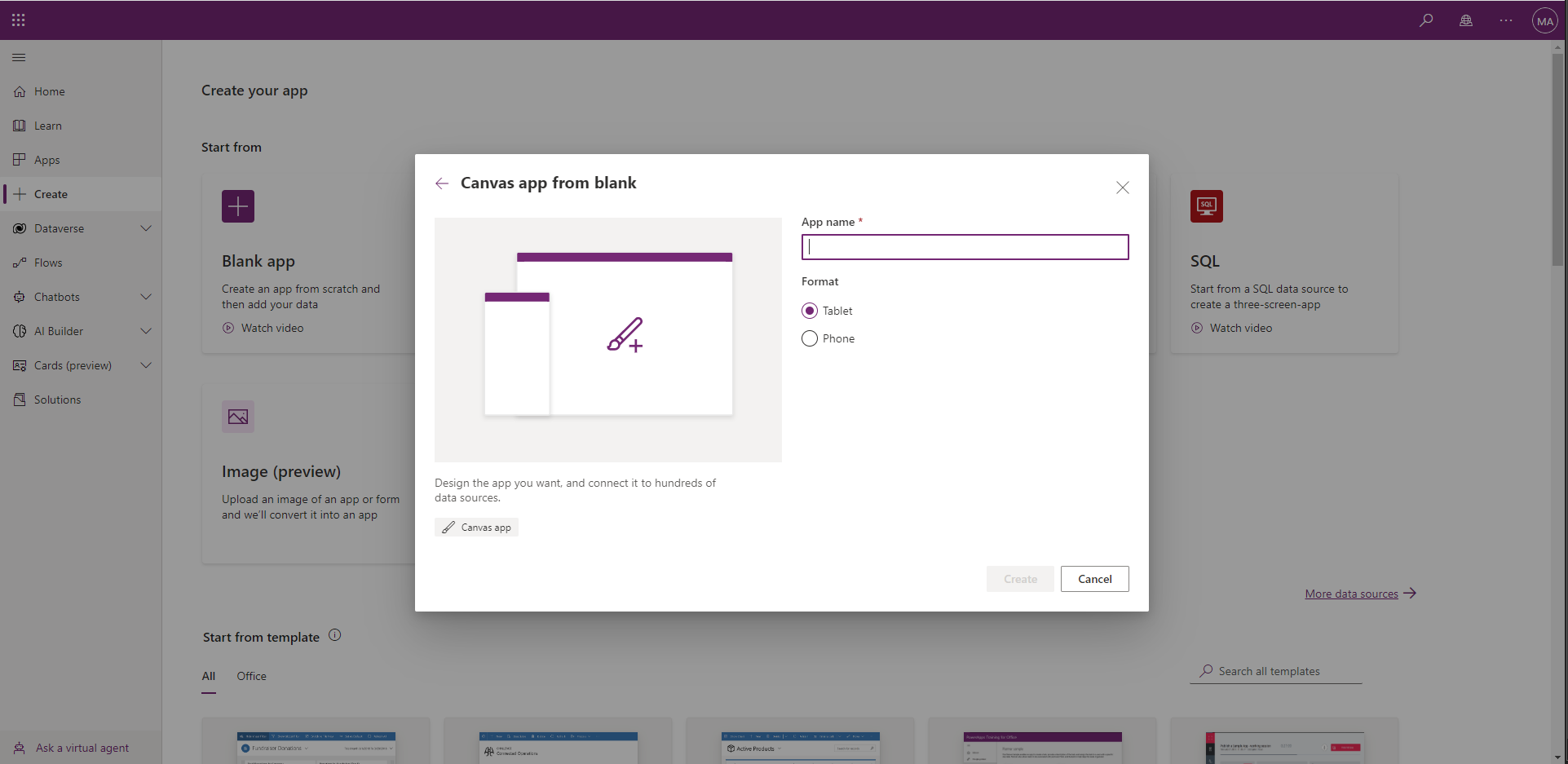 - Canvas app is one of the main types of applications that you can create in PowerApps. It gives you a blank canvas and allows you to design the form, also it allows you to connect with many types of data sources. If you want to make your own design, then the Canvas app is the best choice for you. The Canvas app provides you with a blank canvas and you will design your app screen-by-screen, which means that you will have full control of building your own design.
