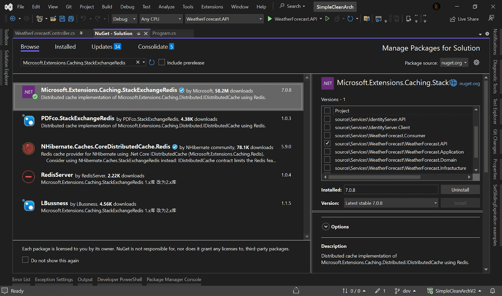 - Add Microsoft.Extensions.Caching.StackExchangeRedis to our project from nuget package.