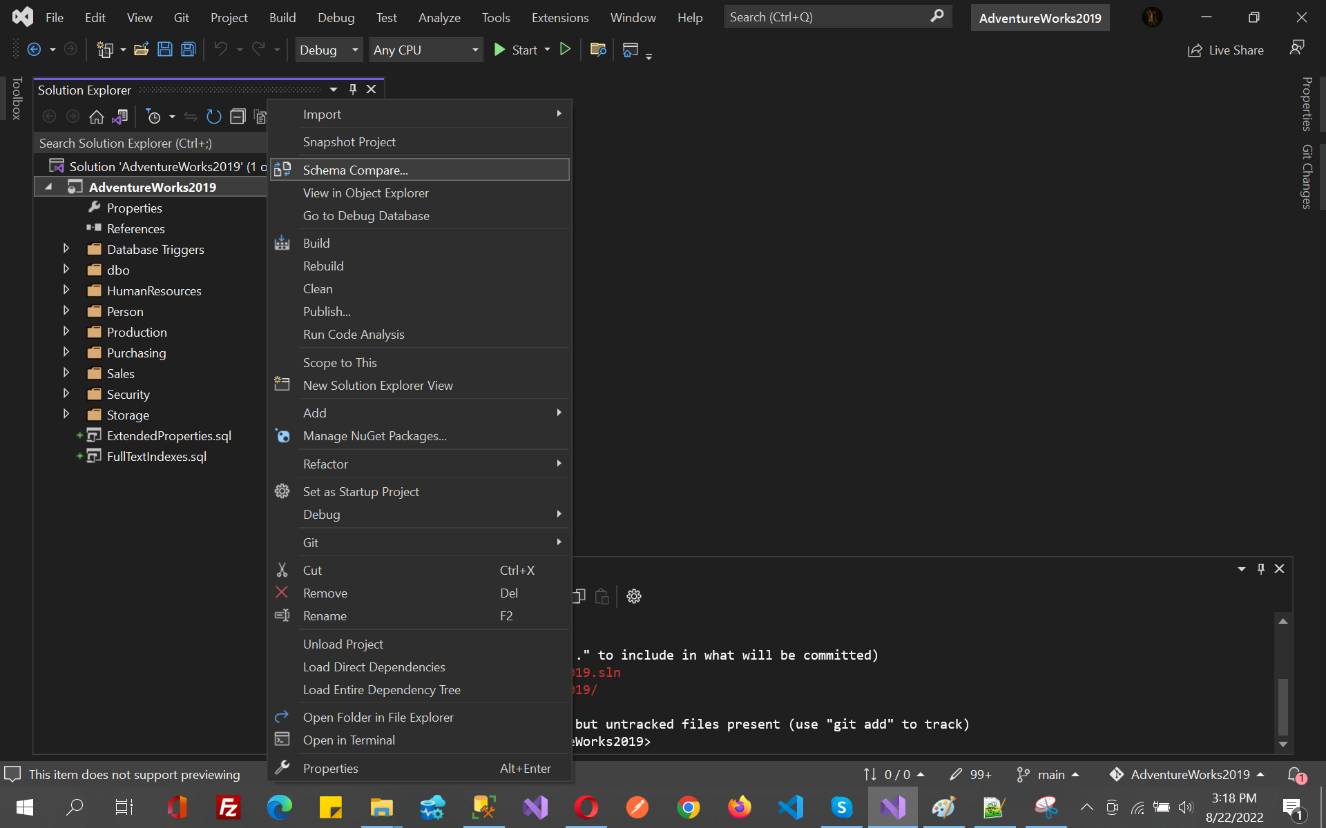 6. To compare the Source Database and our target project, Right click on the project name the select ‘Schema Compare’