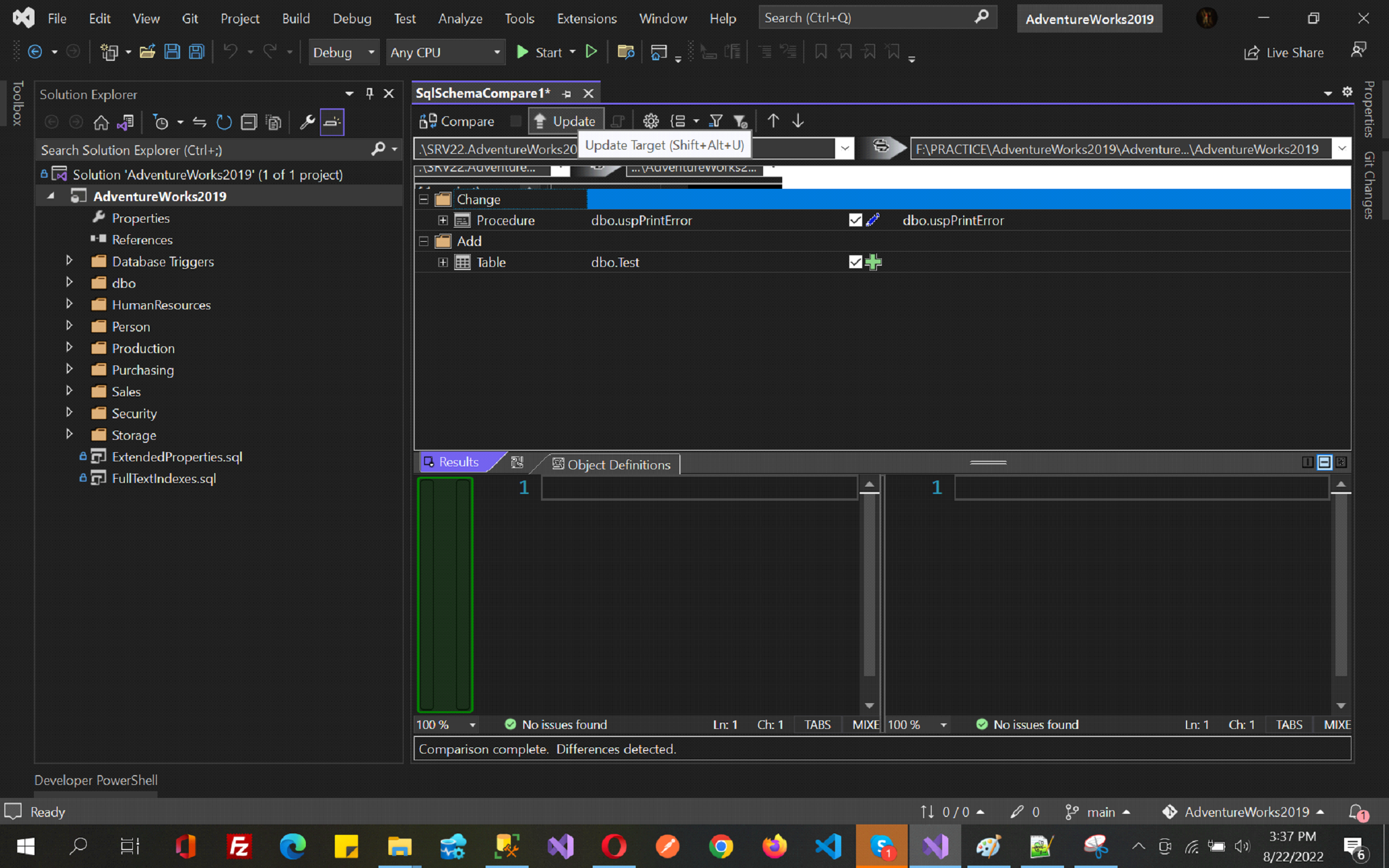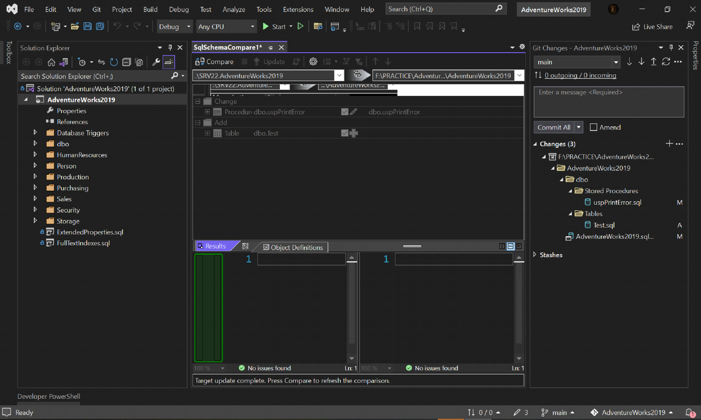 5. Now update a Stored procedure (Add comment) from source Sql Server Database as well as create a new table for testing purpose.